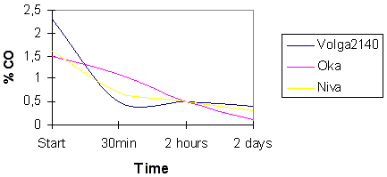 На графиках представлены некоторые данные, взятые из многочисленных актов испытаний устройства, показывающие динамику снижения содержания угарного газа в выхлопных газах.