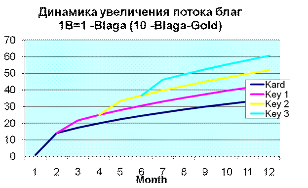 Приобретая ключи увеличения мерности потока благ, пользователь системы получает возможность увеличивать общую динамику (цветные линии на графике применение ключей, нижняя синяя - карта).