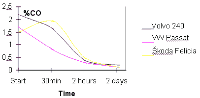 На графиках представлены некоторые данные, взятые из многочисленных актов испытаний устройства, показывающие динамику снижения содержания угарного газа в выхлопных газах.